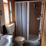 • Badkamer met toilet, wastafel en een douchecabine over de hele breedte.