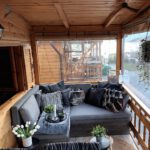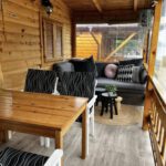 • Zeer ruime veranda ( 8 x 2 meter) met zithoek en tafel en stoelen. De veranda is afsluitbaar met kunststof zeil zodat je ook in het voor en – najaar of als het iets frisser is heerlijk buiten kunt zitten.