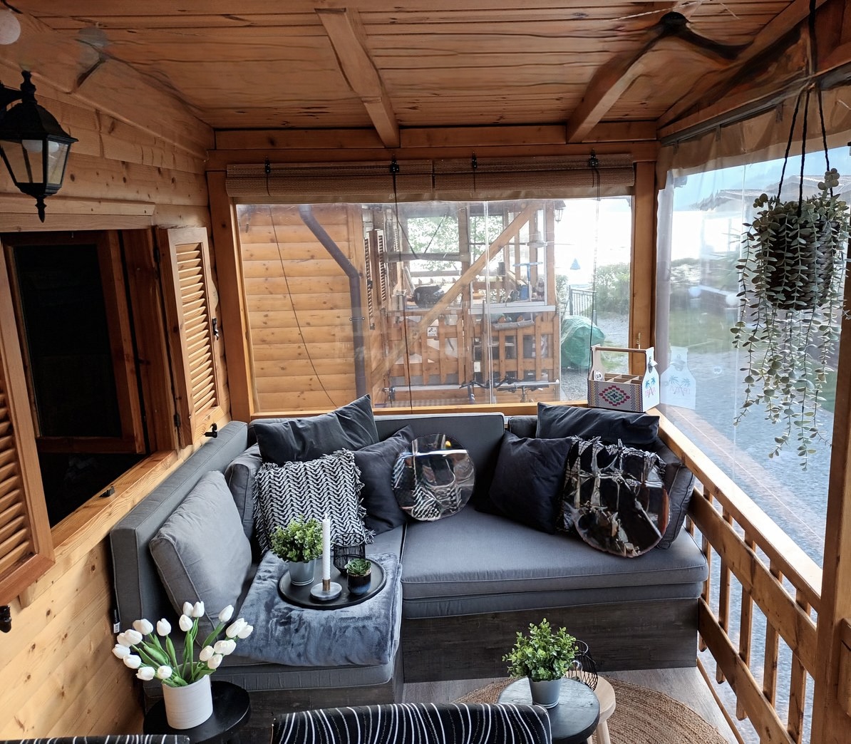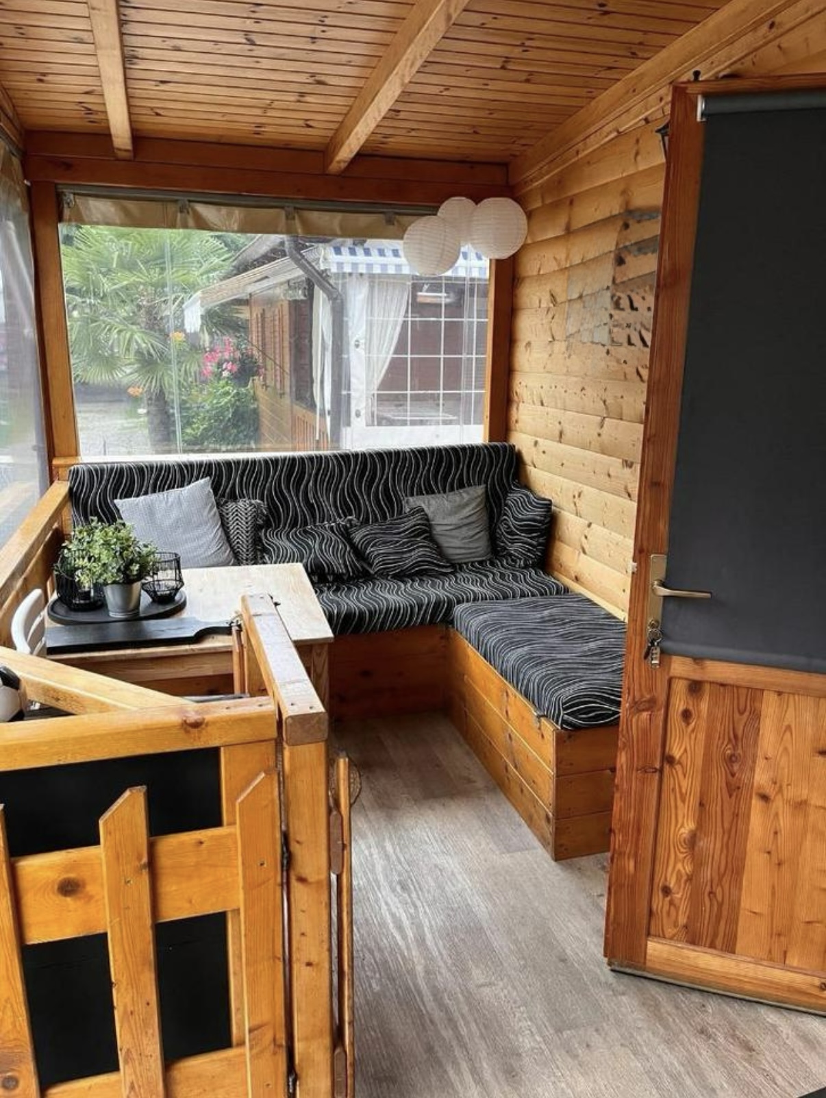 • Zeer ruime veranda ( 8 x 2 meter) met zithoek en tafel en stoelen. De veranda is afsluitbaar met kunststof zeil zodat je ook in het voor en – najaar of als het iets frisser is heerlijk buiten kunt zitten.