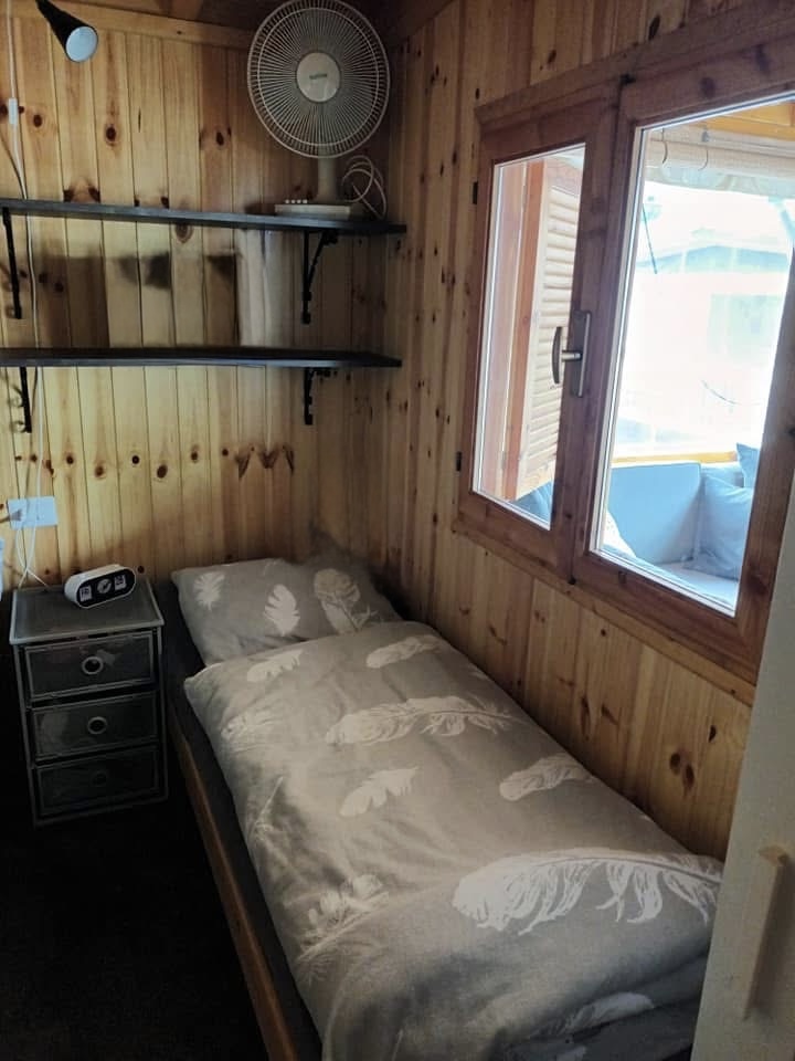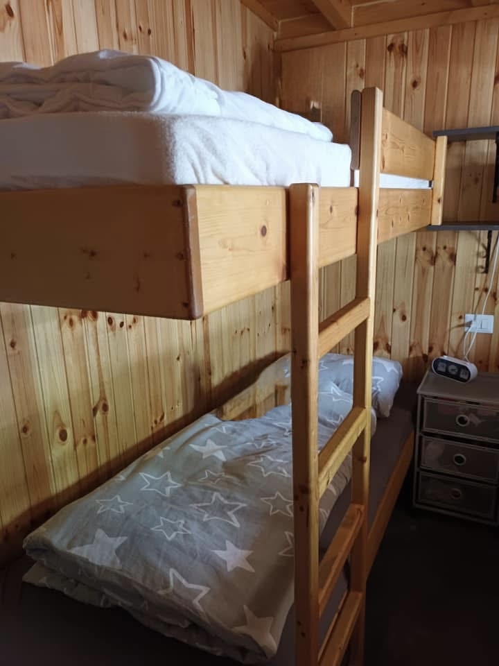 Slaapkamer 2 heeft een stapelbed, een los eenpersoonsbed en een opbergkast