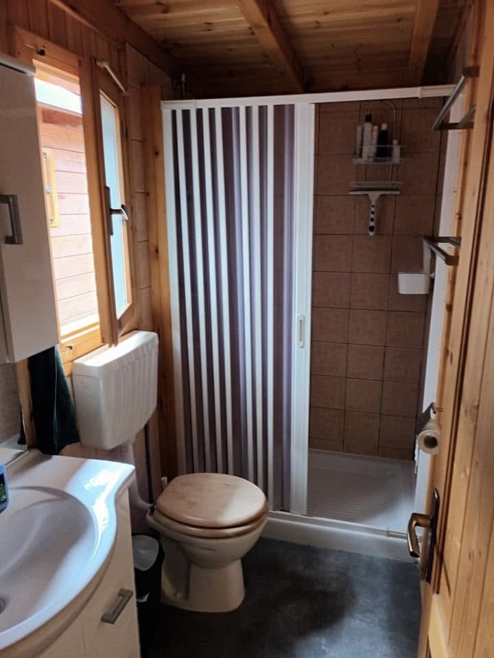 • Badkamer met toilet, wastafel en een douchecabine over de hele breedte.