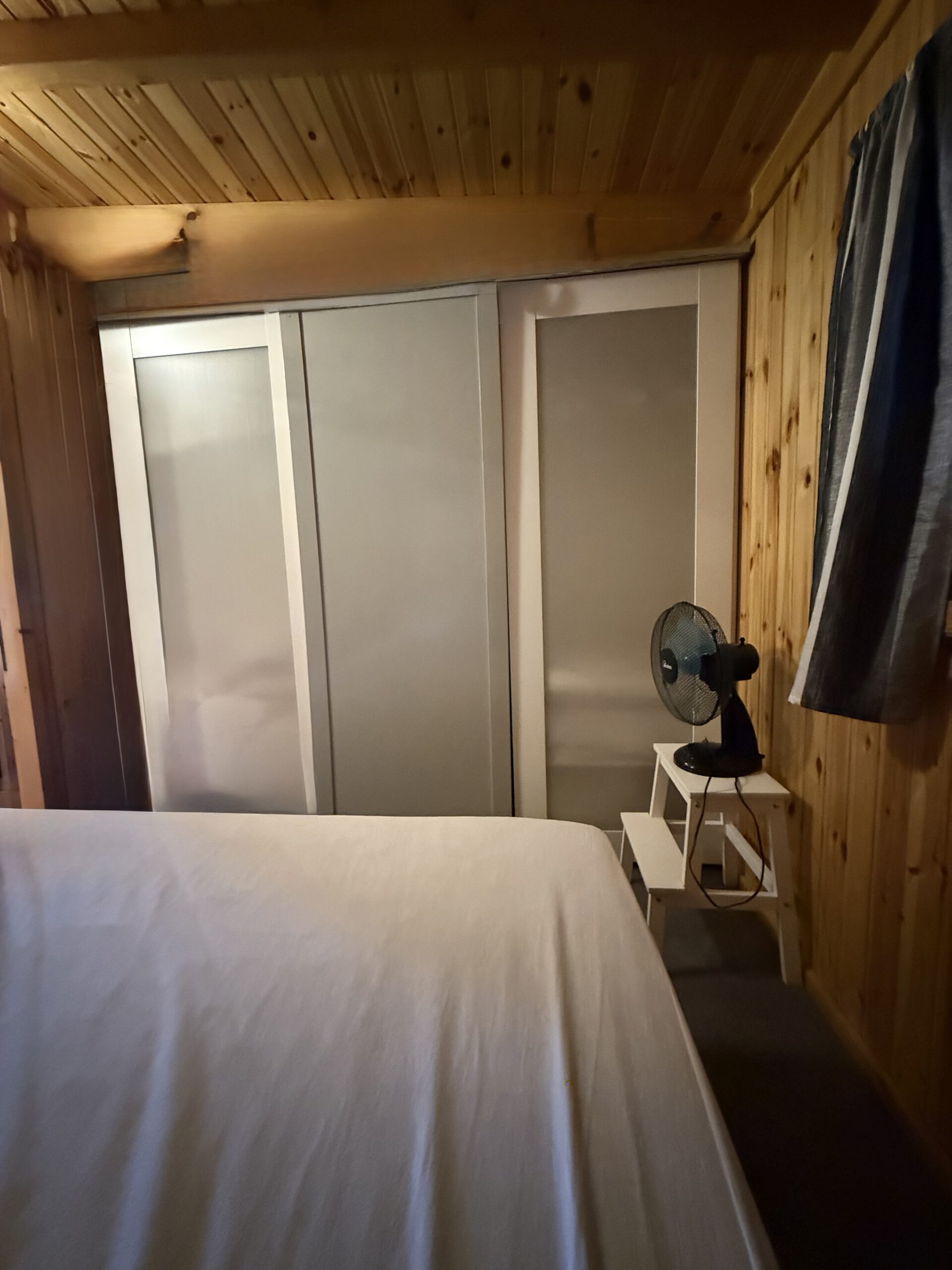 Slaapkamer 1 heeft een tweepersoonsbed en grote kastenwand
